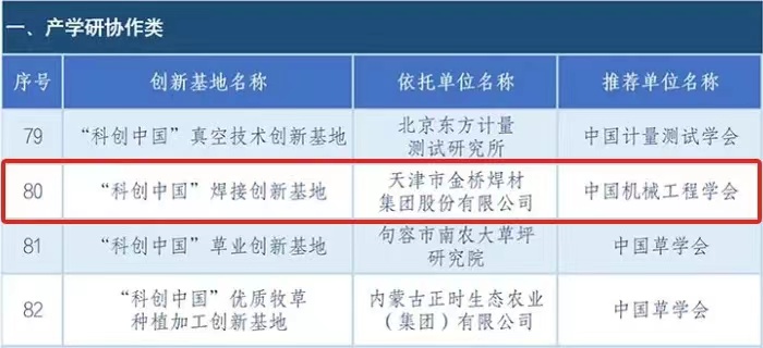 “科創(chuàng)中國(guó)”創(chuàng)新基地是中國(guó)科協(xié)推動(dòng)產(chǎn)學(xué)研協(xié)同創(chuàng)新和科技成果轉(zhuǎn)移轉(zhuǎn)化的合作載體,是“科創(chuàng)中國(guó)”各類資源下沉匯聚的承接平臺(tái),旨在促進(jìn)跨界、跨域、跨境集聚配置創(chuàng)新資源,動(dòng)員更多人才、技術(shù)、數(shù)據(jù)、資本等創(chuàng)新資源,助力地方經(jīng)濟(jì)高質(zhì)量發(fā)展。金橋集團(tuán)憑借良好的創(chuàng)新基地基礎(chǔ)、過(guò)硬的產(chǎn)品研發(fā)和科技攻關(guān)能力以及出色的產(chǎn)學(xué)研落地轉(zhuǎn)化成果,被認(rèn)定為“科創(chuàng)中國(guó)”焊接創(chuàng)新基地,成為天津四家入選產(chǎn)學(xué)研協(xié)作類“科創(chuàng)中國(guó)”創(chuàng)新基地的單位之一。