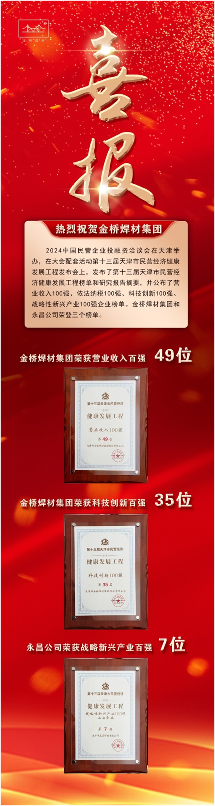 金橋焊材集團(tuán)入選第十三屆天津市民營經(jīng)濟(jì)健康發(fā)展工程多個(gè)榜單